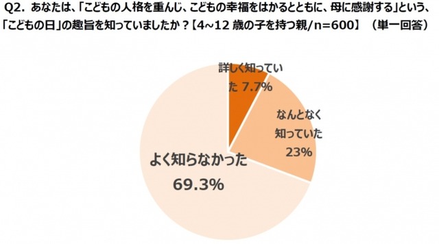 「こどもの日」の本当の意味について尋ねたところ、「よく知らなかった」と回答した人は69.3%となり、正しい意味を理解している親はわずか3割のみという実態が明らかとなりました。