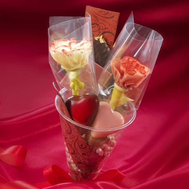 「ル ブーケ ミニヨン」は、この2輪にハート型のボンボンショコラやロッシェ、ルビーチョコレートなどを詰め合わせ、アレンジメントフラワー風に仕上げています。