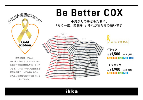 イオングループの株式会社コックス(本社:東京都中央区日本橋浜町1-2-1、代表取締役社長:寺脇栄一)は、「ikka(イッカ)」より女児・男児1型ずつを支援対象商品として、2019年4月19日(金)から28日(日)の期間売上の一部をNPO法人「ゴールドリボン・ネットワーク」へ寄付し、小児がんの支援活動に役立てていただきます。商品は全国のキッズを取り扱う「ikka」「CURRENT」約150店舗と公式オンラインストアを含む8WEBストアにてお買い求めいただけます。