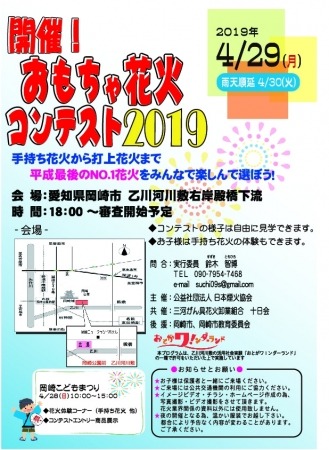 2019年4月29日、愛知県岡崎市にて、おもちゃ花火の楽しさや遊び方を広く知ってもらうために国内の花火メーカーが厳選したおもちゃ花火を審査する一般参加式のコンテストを行います。