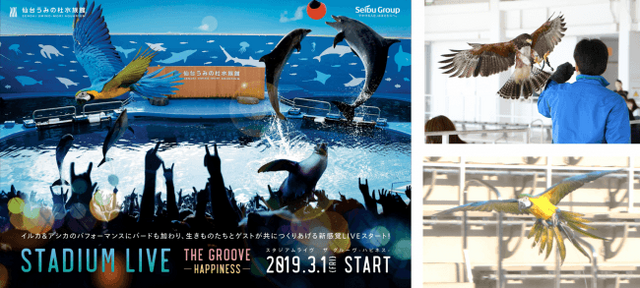 従来の「イルカ・アシカのパフォーンマンス」を一新し、今年3月1日から新たに鳥類(バード)が加わって、好評開催中の「STADIUM LIVE ~THE GROOVE~」は、生きものたちとパフォーマー(トレーナー)、ゲスト(観客)が一体となってつくりあげる、いままでとは違う新感覚LIVEエンターテインメントです。