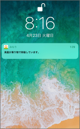 「乗り物移動通知」機能は、子どもが乗り物で移動した時にお知らせする機能です。およそ時速10km以上の移動をした場合、「みもり」が検知し、保護者のスマートフォンにプッシュ通知でお知らせします。この機能により、子どもバスや電車に乗ったタイミングはもちろんのこと、不自然な高速移動(車での連れ去り等)など、万が一の異変にもすぐ気がつくことができます。