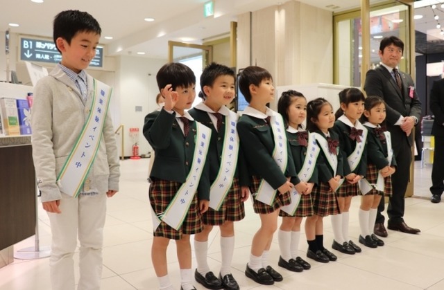 開店時のお出迎えは長く続く百貨店の伝統です。開店の音楽が流れる中、お越しいただいたお客様に感謝の気持ちをこめてお辞儀をし、得意の英語で「Welcome to Matsuzakaya!」と元気よくごあいさつしました。園の制服姿の子供たちに、来店されたお客様からは「あら!可愛らしいわね」と思わず笑顔がこぼれていました。