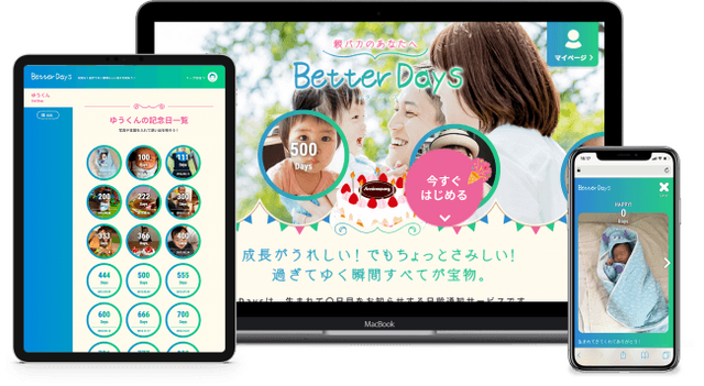 「BetterDays」は、生まれて〇日目をお知らせする日齢通知サービスです。人が生まれてから経過した期間について、年齢という年を基準とした単位が一般的に使われていますが、「BetterDays」では新生児を過ぎても一日一日の成長を、日々の歩みを大切にしてもらいたいという想いで、日を基準とした日齢を身近に感じていただくサービスを無料で提供しています。