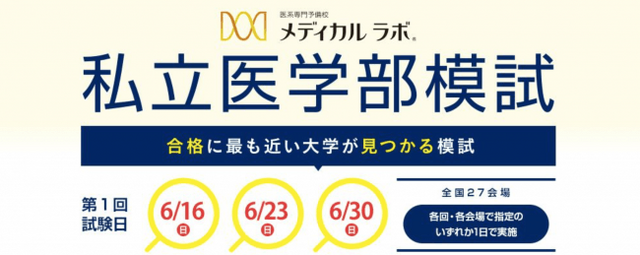 医系専門予備校として合格実績No.1(「医学部予備校ナビ」調べ/2019年度入試1,189名合格)、全国に27校を展開する医系専門予備校メディカルラボでは、合格に最も近い大学を判定する「私立医学部模試」を以下の日程にて、全国27会場で実施いたします。