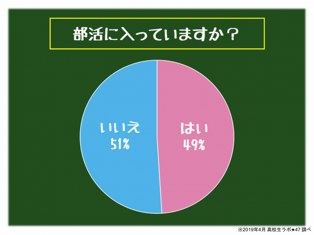 「部活に入っていますか?」という質問では、「はい」と回答した人は49%で、わずかですが「いいえ」(部活に入っていない)が上回りました。