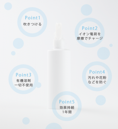 ●特殊なイオン電荷は、摩擦により発生する静電気の力で電荷が補充されるので、コーティング後の布拭きやブラッシング等の摩擦により機能が再活性化され、効果が長続きします(約1年間)。