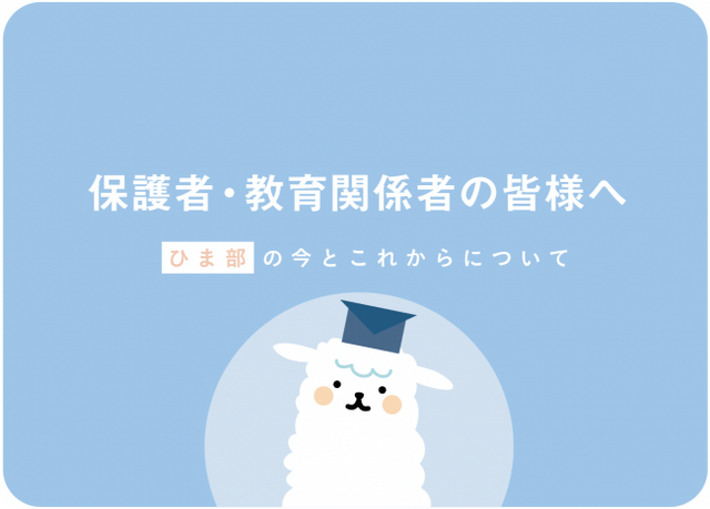 現代社会の若年層に広がる孤独や自殺の問題をなくすために、ひま部が取り組んでいるインターネット時代における新しいコミュニケーションの形、そしてSNSが届ける新価値の構造と共に、 安心安全な居場所づくりに関して、保護者や教育関係者の方々との信頼関係の構築と両者の協力態勢は欠かせません。ひま部と保護者や教育関係者のお互いの「できること」と「できないこと」を認識し、オープンに話合い、そして協力しながら問題解決の道へ進むことを願っております。