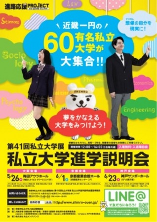こうしたニーズに応えていくため、京阪神私立大学入試広報懇談会(京都・滋賀・大阪・奈良・和歌山・兵庫の60校が加盟)は、加盟校全てが出展する「私立大学進学説明会」を例年実施しておりますが、当社は本年開催の「第41回私立大学展 私立大学進学説明会」の大阪・京都・神戸の3会場の運営について、昨年に引き続き受託し、運営事務局を担当いたします。