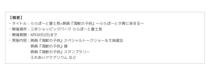 三井不動産商業マネジメント株式会社(所在:東京都中央区 代表取締役社長 青柳雄久)は、映画『海獣の子供』の公開を記念し、6月23日(日)までの期間、三井ショッピングパークららぽーと富士見において、タイアップキャンペーンを開催します。