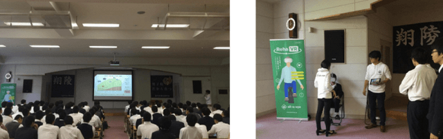 当日は、VRを用いたリハビリ支援機器の開発を行うベンチャー企業の代表 (株式会社 silvereye CEO 汲田宏司氏) と、高齢者の介護現場とリハビリ現場でテクノロジーを活かす支援を行う理学療法士(株式会社Re ambitious 松本裕輝氏)が登壇し、「人口減少や超高齢社会を迎える中、テクノロジーを応用するアイデアや、この時代で必要とされることは何かついて目線を送り続けることが大切」と高校生に熱いメッセージを送っていただきました。講演会に参加した約180名の生徒たちは目を輝かせ、自身の将来への可能性を感じていました。また、本講演会終了後には、VRを用いたヘルスケアソリューション機器「RehaVR」の体験会も実施し、長蛇の列が出来るほど、大きな賑わいを見せました。