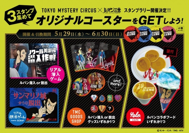 東京ミステリーサーカスでは、現在ルパン三世とコラボレーションした「リアル潜入ゲーム『ノワール美術館 潜入作戦』」が施設3階で開催され、また明日5月30日(木)~7月21日(日)までの期間限定で「リアル脱出ゲーム『サンマリノ城からの脱出』も4階にて開催されます。2公演の同時開催を記念し、本日より公演参加・グッズ・フード購入によってスタンプをためて、オリジナルコースターをGETできるスタンプラリーの開催が決定! コースターはルパン、次元、五ェ門、不二子の4種の中からランダムで1種のプレゼントとなります。