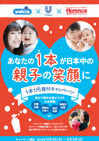 期間中、ウエルシアグループ各店舗にて、ユニリーバ商品お買い上げ1本につき1円を認定NPO法人フローレンスに寄付