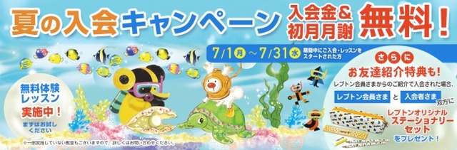 個別指導型の子ども英語教室Lepton(レプトン)を全国1,250拠点でフランチャイズ展開する、株式会社FREEMIND EVANカンパニー(本社:京都市中京区、カンパニープレジデント:北田 秀司)は、ひとりでも多くのお子さまに英語の早期学習を始めていただけるよう、2019年7月1日(月)から7月31日(水)までの間に、キャンペーン対象教室のいずれかに新規でご入会し、レッスンをスタートされた方全員の、入会金および入会月の月謝を“無料”とする 『夏の入会キャンペーン』を実施いたします。