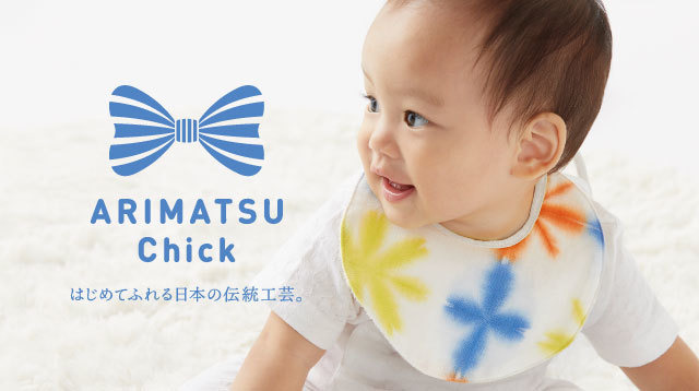 『ARIMATSU Chick(アリマツチック)』は、有松絞商工協同組合と伝統工芸を世界に広めるデザイン集団「ツグモノ」が立ち上げた【子ども向け有松絞り】のブランドです。子どもたちに早くから伝統工芸品に触れてもらいたいという想いから、おしゃれな『乳幼児用スタイ(よだれかけ)』が出来上がりました。