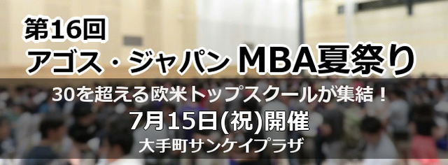 海外トップ大学・大学院留学準備指導校を運営する株式会社アゴス・ジャパン(代表取締役:横山 匡、本社:東京都渋谷区)は、2019年7月15日(月・祝)に、ハーバード、スタンフォード、オックスフォード、ケンブリッジ、INSEAD等、30校を超える欧米MBAトップ校の日本人卒業生・在校生が集結する第16回「アゴス・ ジャパン MBA夏祭り」を開催いたします。