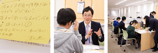 アドバイザーと1対1で講座後に行うアドバイスタイムでは、その日に学んだことを生徒がホワイトボードに書き込みます。ホワイトボードに書くことで、生徒自身が理解できていない問題を明確にし、アドバイザーがその日のうちにフォローします。また、生徒自身が説明を行うことで、知識として定着させる効果も得られます。