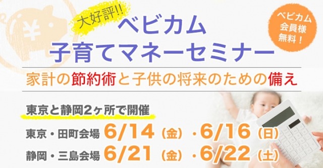 ベビカム株式会社(本社所在地:東京都港区、代表取締役:安西正育)は、「ベビカム子育てマネーセミナー」を6月14日(金)16日(日) 東京芝浦の本社オフィス イベントスペース、6月21日(金)22日(土)静岡三島のみしま未来研究所 多目的スペースにて開催いたします。
