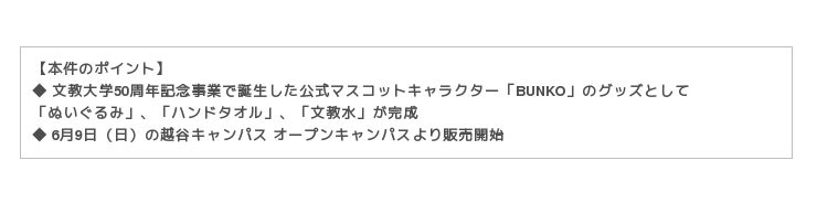 文教大学は公式マスコットキャラクター「BUNKO」(ブンコ)のオリジナルグッズ販売を6月9日(日)より開始します。販売するグッズは、「ぬいぐるみ」、「ハンドタオル」、「文教水」の3種類です。
