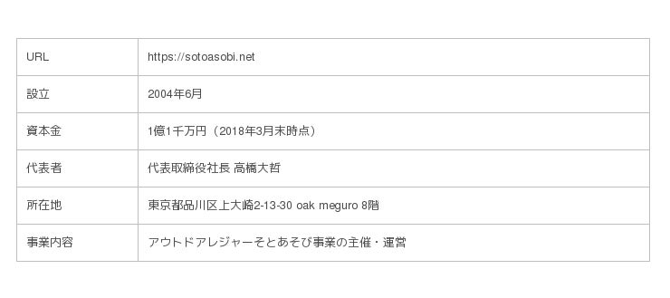 株式会社そとあそびが運営する「SOTOASOBI」は、国内最大級のアウトドアレジャー専門の予約サイトです。全国のアウトドアレジャーの中から、「SOTOASOBI」独自の安全基準を満たした安心で満足度の高いツアーをご紹介しています。アウトドアレジャーが初心者の方にも、自然の中であそぶことが大好きな方にも、心と身体の全部で自然をあじわっていただく特別な体験時間を提供すること、その活動を通じて日本のアウトドアレジャー業界全体の信頼向上に寄与することをビジョンとしています。