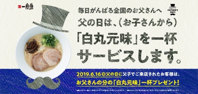 株式会社力の源ホールディングス(本社:福岡市中央区、代表取締役会長兼社長:河原 成美)傘下の株式会社力の源カンパニーが運営する「一風堂」では、2019年6月16日(日)の父の日に一日限りの特別企画として、父子でご来店のお客様を対象に、お父さん分の「白丸元味」をプレゼントする「父の日、全国のお父さんに白丸一杯を贈ります!」キャンペーンを日本国内の一風堂80店舗限定で実施いたします。