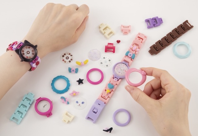 工具などを一切使用せずに、時計本体とベルトパーツ、フレームパーツ、デコパーツ、デザインフィルムなどの部材を組み合わせて、自分だけのオリジナルのアナログ腕時計を作れます。パーツの組み合わせパターンは100万通り以上で、洋服や小物とのコーディネートに合わせたり、塾やお出かけなどのシーンに合わせたりと、さまざまなアレンジをお楽しみいただけます。