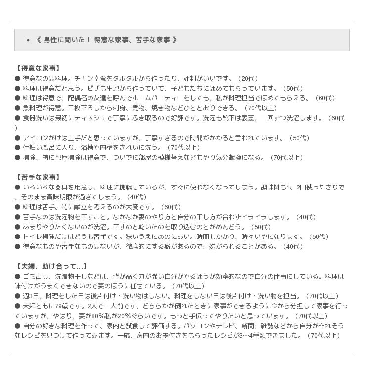 最後に、家事をしている男性に、得意な家事と苦手な家事を自由回答で教えてもらいました。「料理は得意」という人から「料理は苦手」「アイロンがけは上手」という人まで、さまざま。「丁寧すぎるので時間がかかる」「徹底的にする癖がある」というところに“男の家事”らしさを感じます。いずれにせよ、それぞれがんばって家事に取り組んでいることが伝わってきました。印象的だったのは70代以上の回答。退職後、夫婦で分担しながら、なれない家事に奮闘している様子がうかがえました。互いに助け合って、毎日の家事に前向きに過ごせたらすてきですね。
