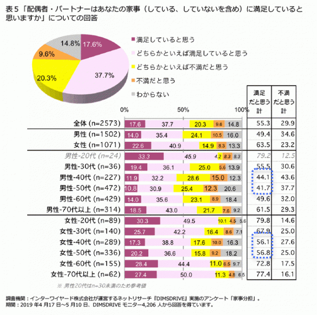 今度は、家事をしているいないにかかわらず、配偶者・パートナーと同居している男女に、相手が自分の家事に満足しているかどうかを聞いてみました。