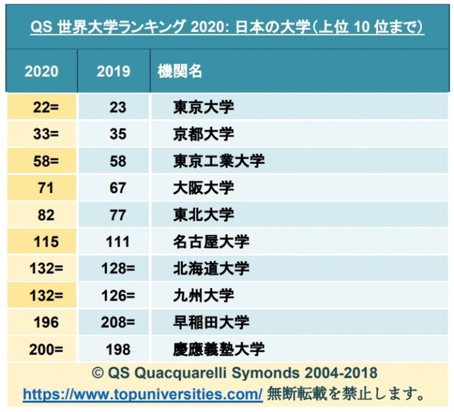 QS Quacquarelli Symonds社(QS)が作成し、世界で最も閲覧されている世界大学ランキングの最新版によれば、高等教育セクターの国際化に向けた日本の大学の試みは、ランキングの結果としてその成果を表すには至っていません。本日発表された第16回QS 世界大学ランキング2020では、ランクインした日本の41大学のうち、24校が順位を落としました。また、研究パフォーマンスにおける上位100位以内に日本の大学が入らなかったのは初めてのことです。