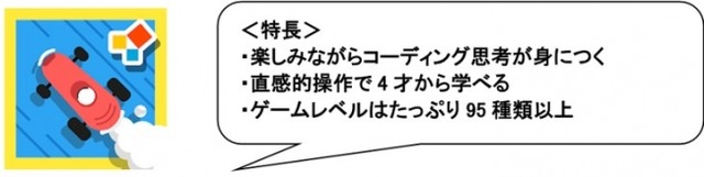 本アプリは、EDOKI ACADEMY社が開発した「Code Karts」(有料版)をauスマートパス用に改変したもので、ゲーム感覚で学べるプログラミング的思考学習アプリです。ブロックを組み合わせてレーシングカーをゴールまで導くゲームで、直感的に操作できるので4才から学べます。ゲームを進めていくとさまざまな仕掛けのパーツにより、徐々に難易度が上がっていきます。ゲームレベルはたっぷり95種類以上を搭載しています。