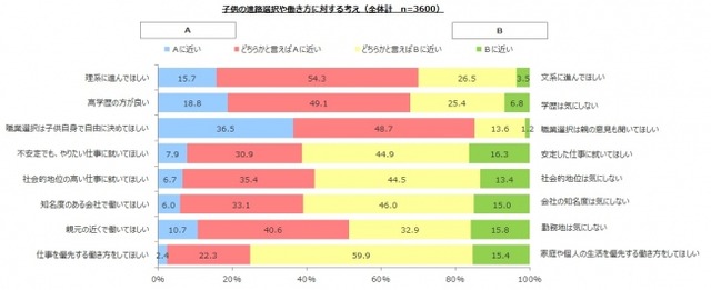 子供の将来の進路選択や働き方に対してどのように考えているかを聞いた。具体的には、「専攻」「学歴」「職業選択」「職業」「社会的地位」「会社の知名度」「勤務地」「ワーク・ライフ・バランス」の8項目について、それぞれ項目内でAとBのどちらの考えに近いのかを4尺度で聞いている。