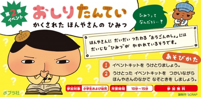 株式会社ポプラ社(本社:東京都千代田区、代表:千葉均)は、次の8月下旬の「おしりたんてい」読み物新刊発売にさきがけ、幼児から小学生を対象とした「おしりたんてい なぞときイベント」第2弾を2019年6月29日(土)から全国約3,300書店で開催します。第1弾に続き、謎制作はリアル脱出ゲームを企画運営する株式会社SCRAP(本社:東京都渋谷区、代表:加藤隆生)が担当し、子どもたちが書店で本格的な「なぞとき」を楽しめる企画となっています。