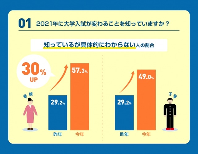 2021年度入試からスタートする大学入試改革の内容について、これまでさまざまな情報が出てきたことで世間における認知が広まってきました。しかし、入試が近づくにつれて大学入試が具体的にどう変わるのかといった準備や対策に、多くの方々が不安を抱えていることがわかりました。