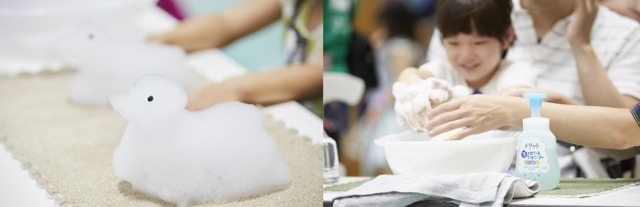 泡アートとは、シャンプーを泡立て、様々な形を子どもの頭に乗せて楽しむというアートで、インスタグラムを中心にSNSで大人気となりました。今回のワークショップでは、泡アートのスペシャリスト・桃井克典氏を講師に招き、お子さまたちが泡づくりのコツや形のつくり方を教えてもらいながら泡アートにチャレンジしました。ワークショップに参加したお子さまたちからは、「お母さんと一緒に泡で遊べて楽しかった」「また泡で遊びたい」といった声が上がりました。また、お子さまと一緒に参加したお父さん・お母さんからも「子どもが泡をつくろうと奮闘する姿を見て、子どもの成長を感じた」「楽しそうに泡で遊ぶ子どもを見て、家のお風呂でも泡遊びをしてみようと思った」等の声がありました。