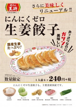 令和の時代に入り、餃子の王将がお客様に提案する「にんにくゼロ生姜餃子」をどうぞお召し上がりください。