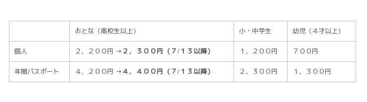 おとな(高校生以上)のみ、入場料金、および年間パスポート料金が変更となります。