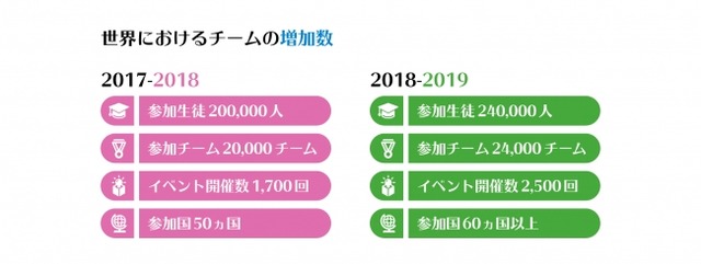 2018-2019シーズンにVEXに登録されたイベント(競技大会・練習試合・リーグ・ワークショップ)は、世界中でおよそ2,500回登録され開催されました。2017-2018シーズンから比べると1.47倍のイベントの開催数が増えたことになります。またチーム数も年々増え続け、現在世界で競技登録されているチーム数は、24,000チームに上ります。