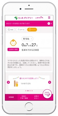 山梨市に採用された『たっち ダイアリー』は、スマートフォン・タブレット端末・PCに対応したサービスで、妊産婦と子どもの健康データの記録・管理や予防接種のスケジュール管理、出産・育児に関するアドバイスの提供など、育児や仕事に忙しい母親や父親を助けてくれる便利な機能が充実しています。