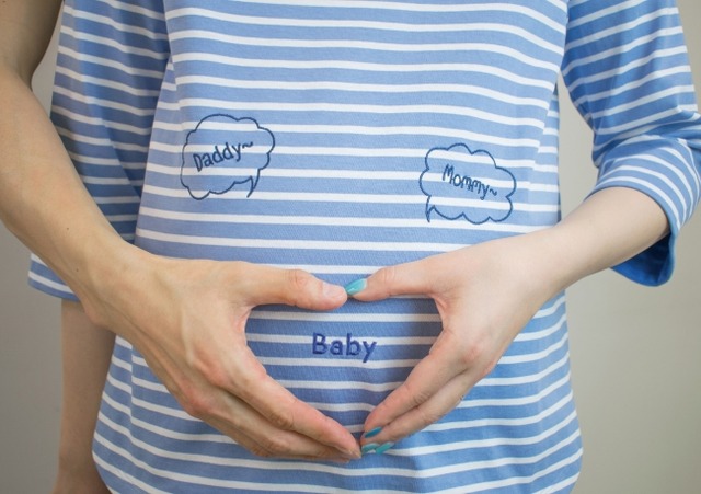 ・左手がママ、右手がパパでハートマークを作り、刺繍を施した“Baby”の文字を囲むと、まるでお腹から赤ちゃんがママとパパを呼んでいるかのように見えます。