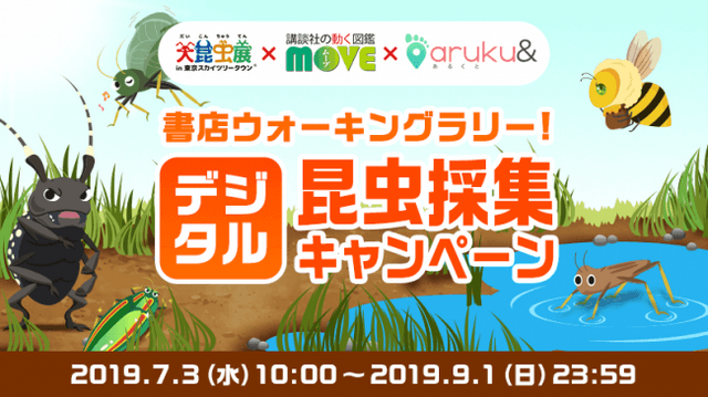 今回の連動企画では、「aruku&」を通じて昆虫の魅力や大昆虫展の世界観を感じていただきながら、各書店で昆虫展の世界を深める体験をしてもらい、イベントにご来場いただくことを目指しています。また、本企画の参加書店では、講談社より発刊の図鑑「動く図鑑MOVE」シリーズで特に人気の高い商品を集めたフェアを開催しており、対象商品を購入した方には「MOVEオリジナルポスター」をプレゼントいたします。さらに、首都圏内の企画参加書店では、「大昆虫展in東京スカイツリータウン(R) ~みんなで応援!昆虫メダリスト~」入場割引券付きのしおりを配布いたします。この機会に是非「aruku&」をダウンロードして、書店をめぐるデジタル昆虫採集を楽しみながら、図書カードなどの素敵な賞品をGETしていただき、「大昆虫展in東京スカイツリータウン(R) ~みんなで応援!昆虫メダリスト~」にも足をお運びください!