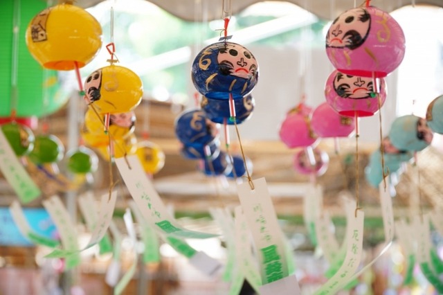 20日(土)・21日(日)には、江戸風鈴の製作を手掛ける職人 篠原正義さんによる「厄除だるま風鈴」名入れサービスを開催いたします。各日先着300個限定(無料)で、毎年一番人気の催し物です。また、20日(土)には、平成11年の第4回から毎年続けられている「風鈴市 踊り練り込み」が開催されます。仲見世通から始まり、大本堂前で大きな円となる踊り練り込みは壮観で、昨年は500人が参加しました。