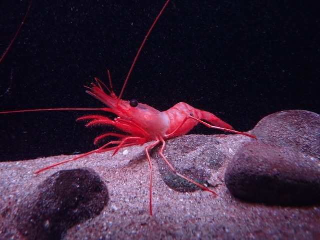 今年の1月16日に新種として3種のエビが公表され(Komai & Hibino, 2019: Zootaxa 4545 (1))、現在、2種を当館で展示していますが、ついに最後の一種が生存した状態で捕獲され展示を開始しました!クレナイモロトゲエビは、生息水深が深く、水質や水温差に非常に敏感であるため、これまで生存した状態で採集することができませんでした。今回、現地の漁業者の多大なご協力で、展示個体を採集することに成功しました。