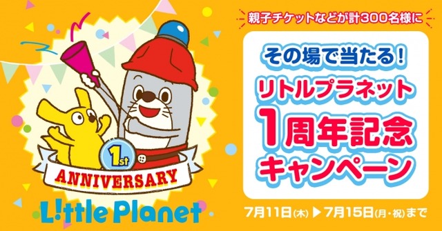 遊びが学びに変わる次世代型テーマパーク「リトルプラネット」(http://litpla.com)を運営する株式会社プレースホルダ(本社:東京都品川区、代表取締役CEO:後藤貴史)は、7月11日(木)にリトルプラネットの常設パーク誕生から1周年を迎えることを記念して、ご来場のお子さま全員がリトルプラネットオリジナルの“デジタルくじ引き”に挑戦できる「その場で当たる!リトルプラネット1周年記念キャンペーン」を7月11日~15日に6つのパークで同時開催いたします。