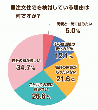 注文住宅を検討している理由は何ですかという質問に対して、もっとも多かった回答は「自分の家が欲しい」で34.7%でした。