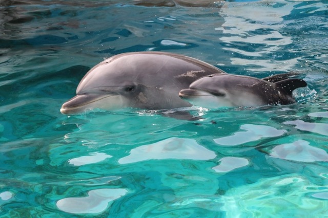 イルカの赤ちゃんは、母親のバニラに母乳をもらいすくすく成長しています。最近はバニラと乳母役のエリーと遊びながら、2頭の間を行き来して元気に泳いでいます。遊んでいる最中に、わずかですがジャンプを見せることもありとても活発です。