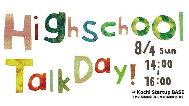 エイチタス株式会社(本社:東京都千代田区、代表取締役:原 亮/小澤 剛)が運営するKochi Startup BASE(R)は新たな取り組みとして、高校生を社会人がゆるやかにつながり合う場『High School Talk Day!』を2019年8月4日(日)に開催いたします。