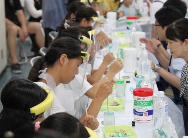 実験体験イベントでは、企業の研究者や大学の先生の指導のもと、小学校の授業ではできない趣向を凝らした実験が体験できます。光を当てると固まる樹脂、貼り付けたらすぐにくっつく接着剤、普通は混ざらない水と油を混ぜる実験など、バラエティ豊富で自由研究に活かせる面白い実験がたくさん。このほか、元素を学ぶ「化学検定」もあります。