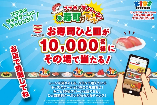 コロワイドグループのかっぱ寿司(カッパ・クリエイト(株) 本社:神奈川県横浜市 代表取締役社長 小澤俊治、以下「かっぱ寿司」)と、こども・アニメ専門チャンネル キッズステーション((株)キッズステーション 東京都港区 代表取締役社長 滝山雅夫、以下 「キッズステーション」)は、2019年7月13日(土)より、かっぱ寿司のお寿司ひと皿が(※注)が1万名様にその場で当たる“スマホでズバーン!お寿司をゲット”キャンペーンを行います。