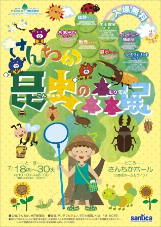 イベント内容:夏休みの特別企画として子どもたちに人気のカブトムシ・クワガタムシを自分で見つけることができる「昆虫の森」をさんちかホールで再現。世界のめずらしいカブトムシも展示。期間中はカブトムシやクワガタムシなどの昆虫販売コーナー、恒例となった木工教室も行います。※木工教室は7月20日(土)~30日(火)実施 11:00~、13:00~、15:00~各20名程度。
