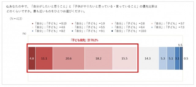 ■「自分がしたいこと」と「子どもがやりたいこと」の優先比率は、「子ども優先」が約7割。